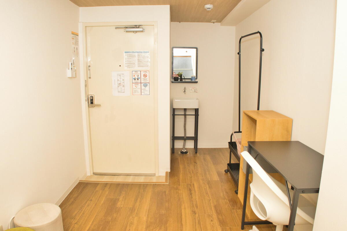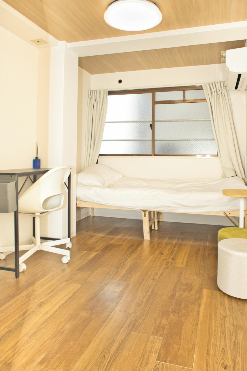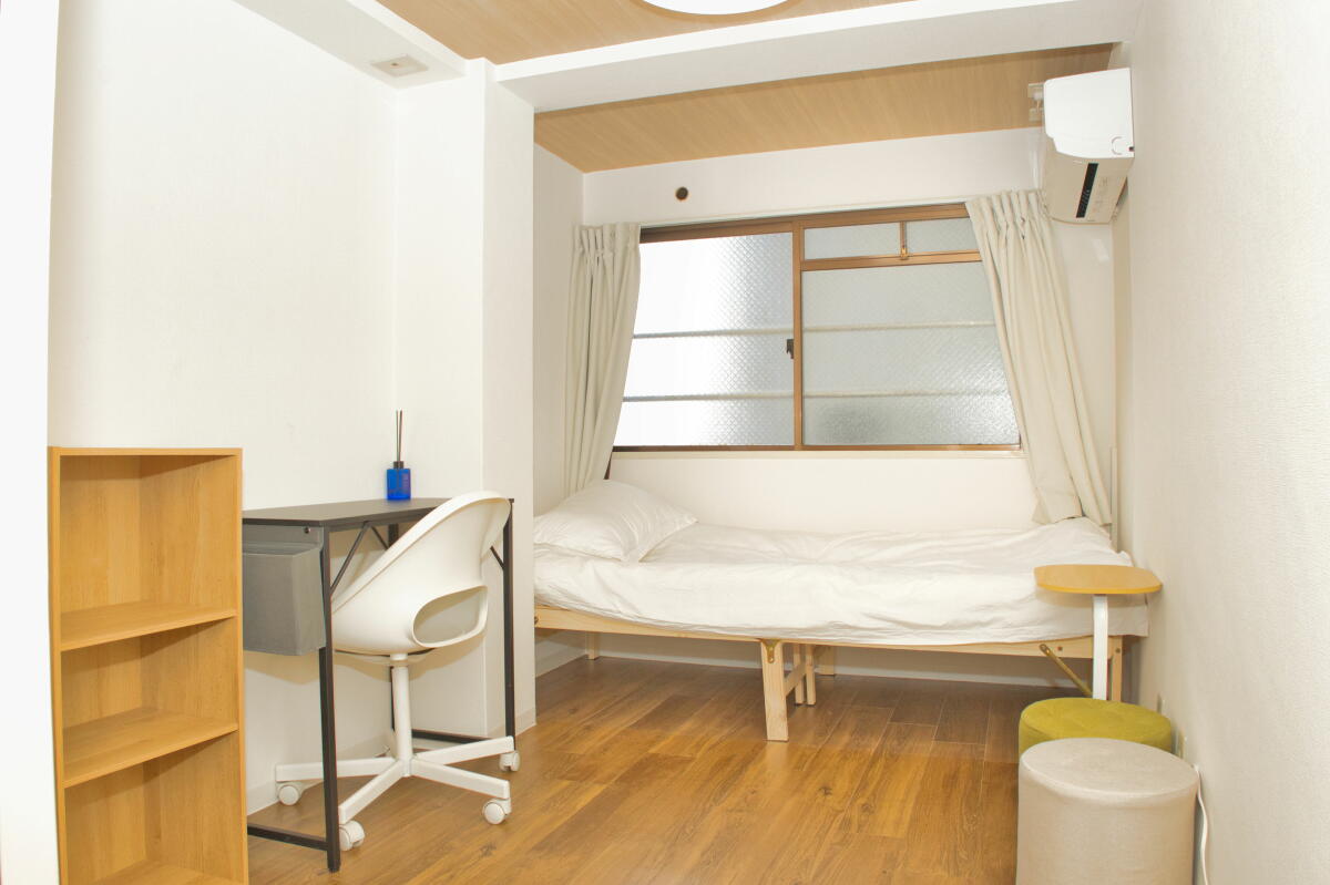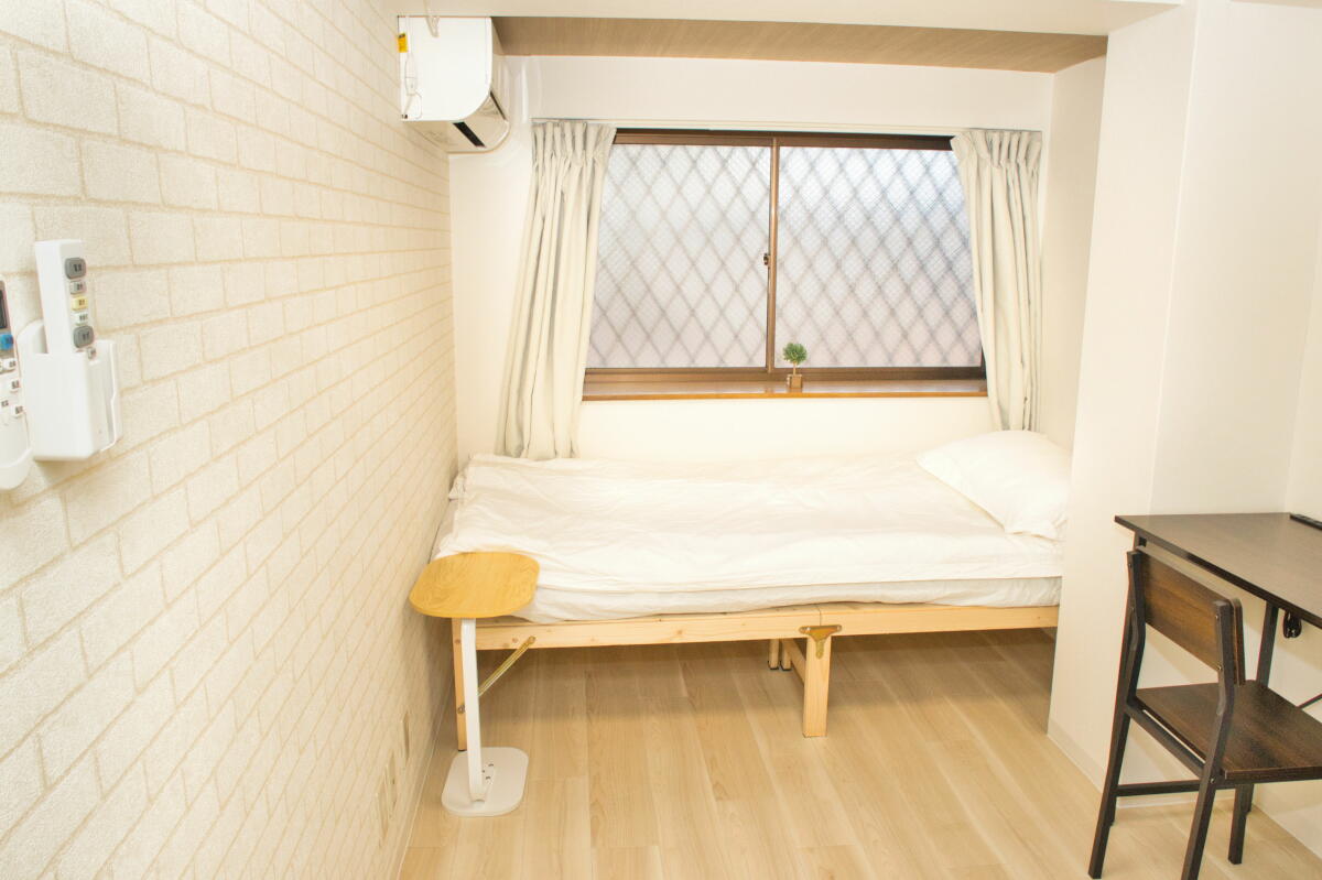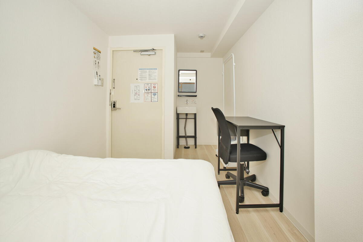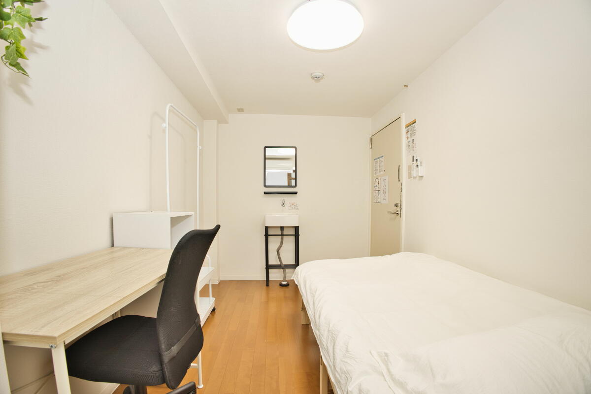 26名定員 / 各個室は7.5~8㎡・ベッド、エアコン、冷蔵庫、机、椅子、バス・トイレ・洗面、収納付き