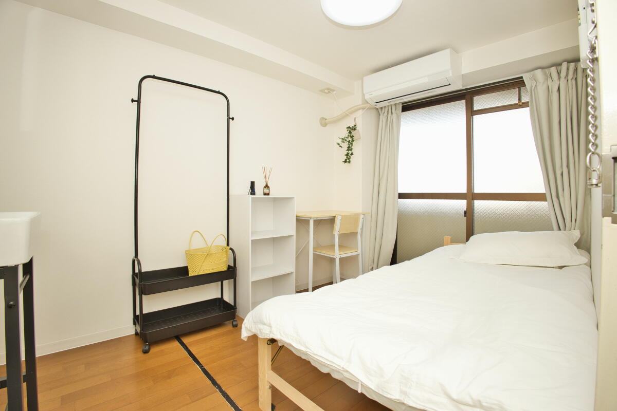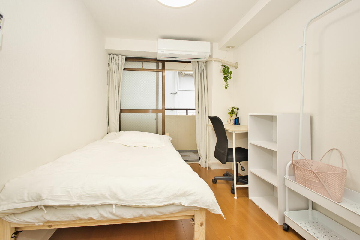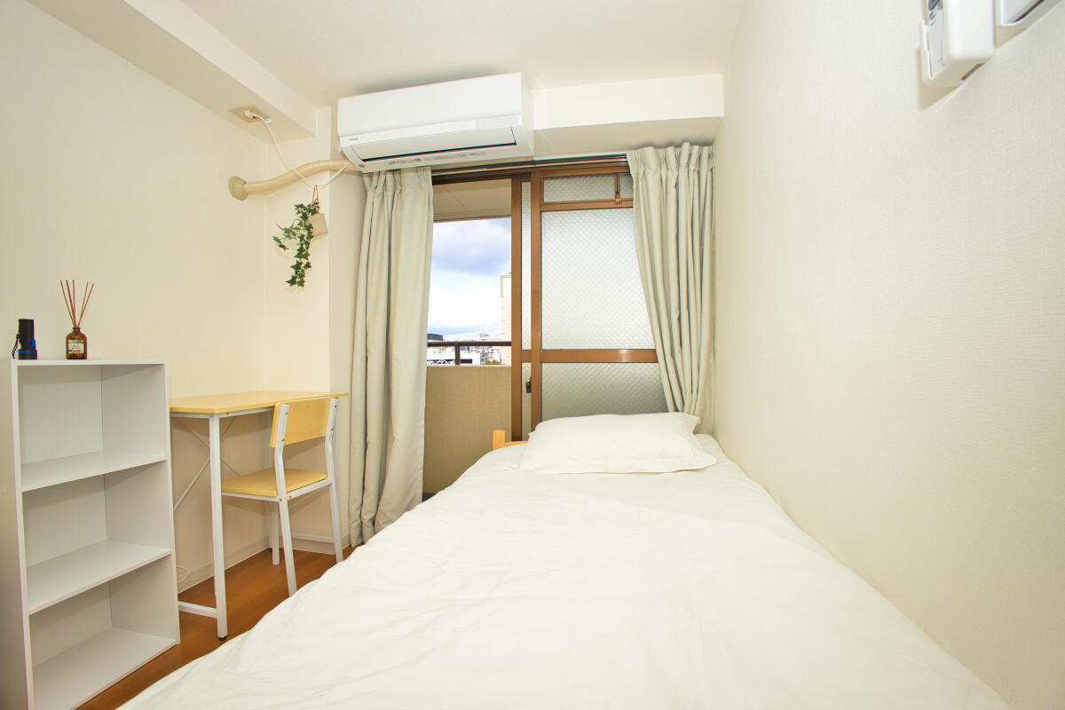 - ベッド、エアコン、机、椅子、収納、洗面台、カーテン、ベランダ