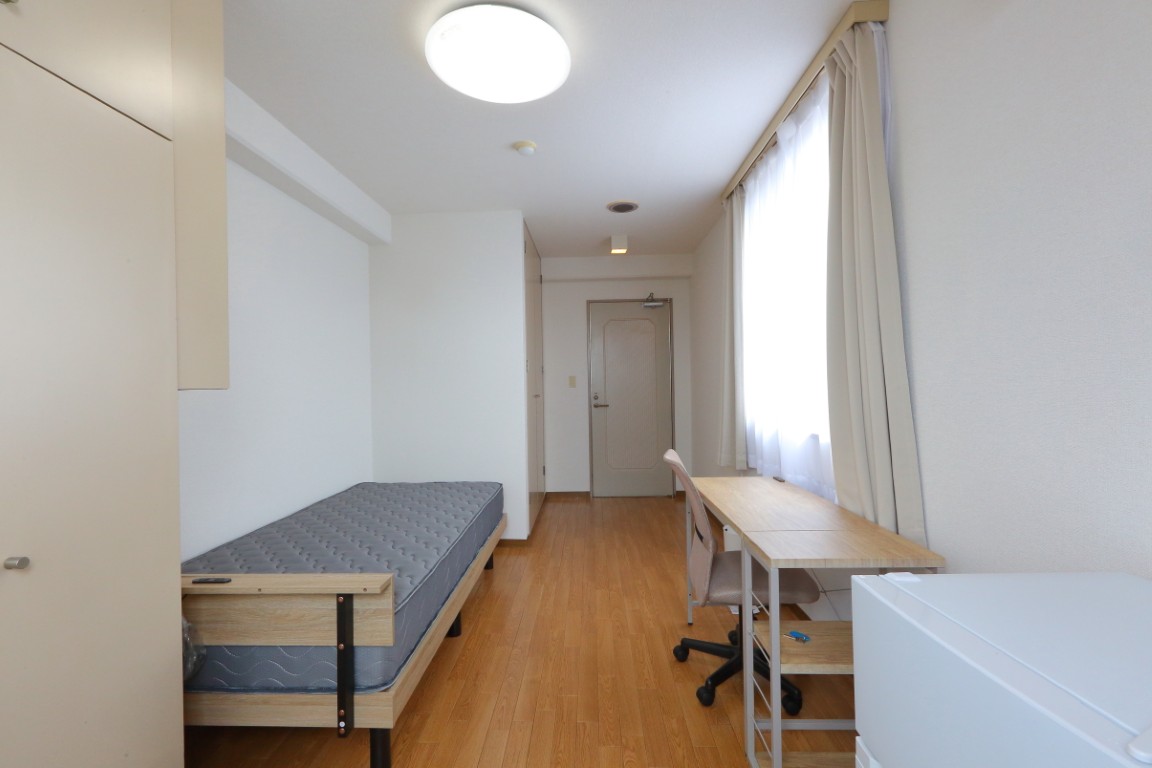 Bed, air conditioner, refrigerator, desk, chair, storage, curtains, balcony